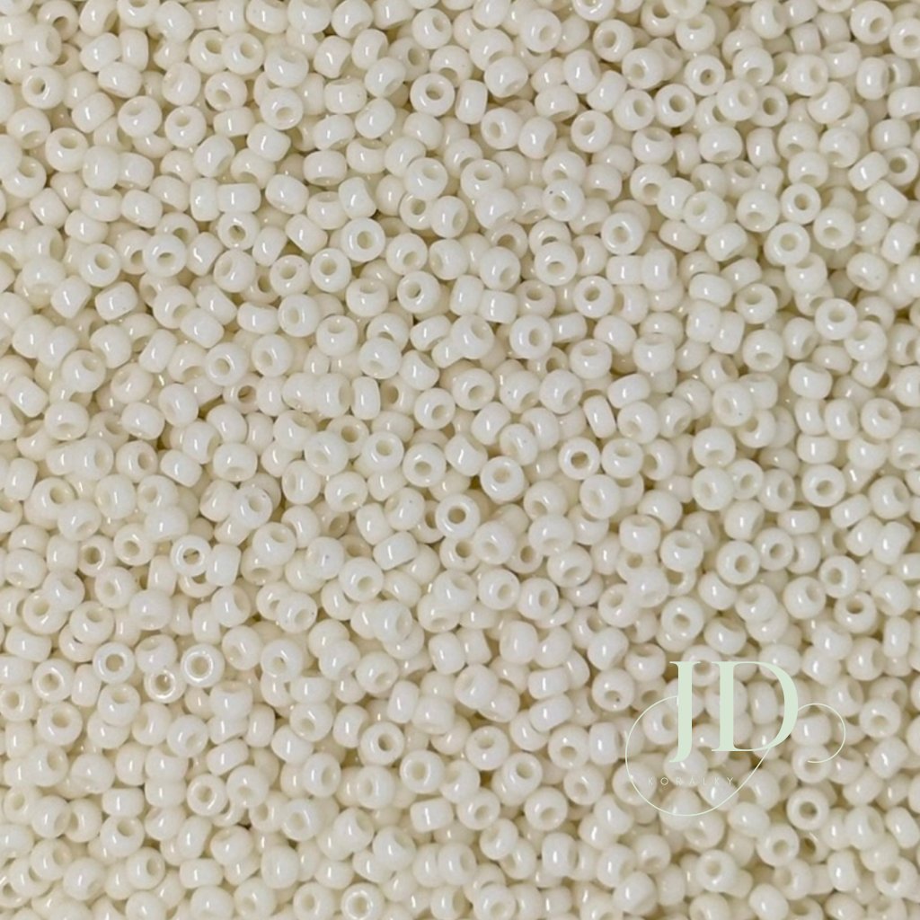 Neprůhledné korálky v jemném slonovinovém odstínu s hladkým a lesklým povrchem.