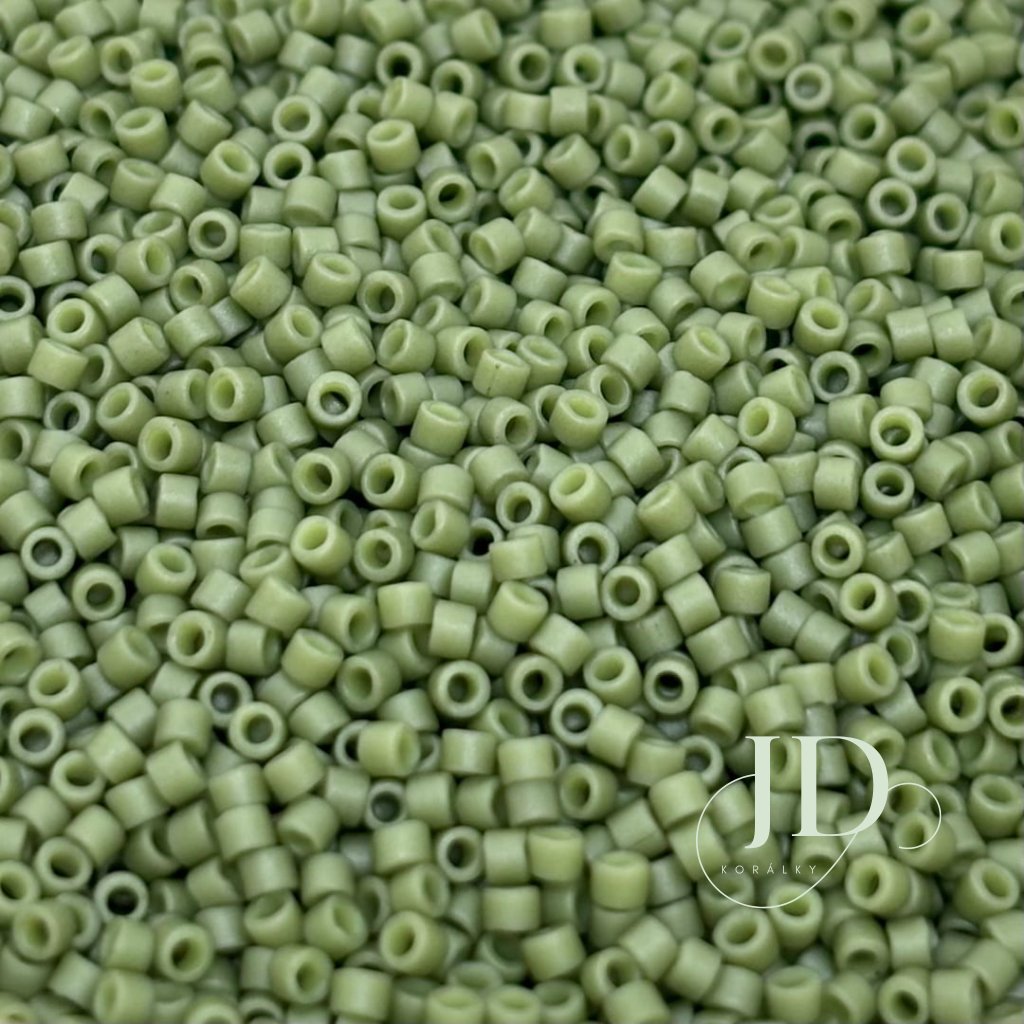 Matné korálky Miyuki Delica 11/0 v olivově zeleném odstínu, ideální pro přírodní a podzimní ladění šperků.