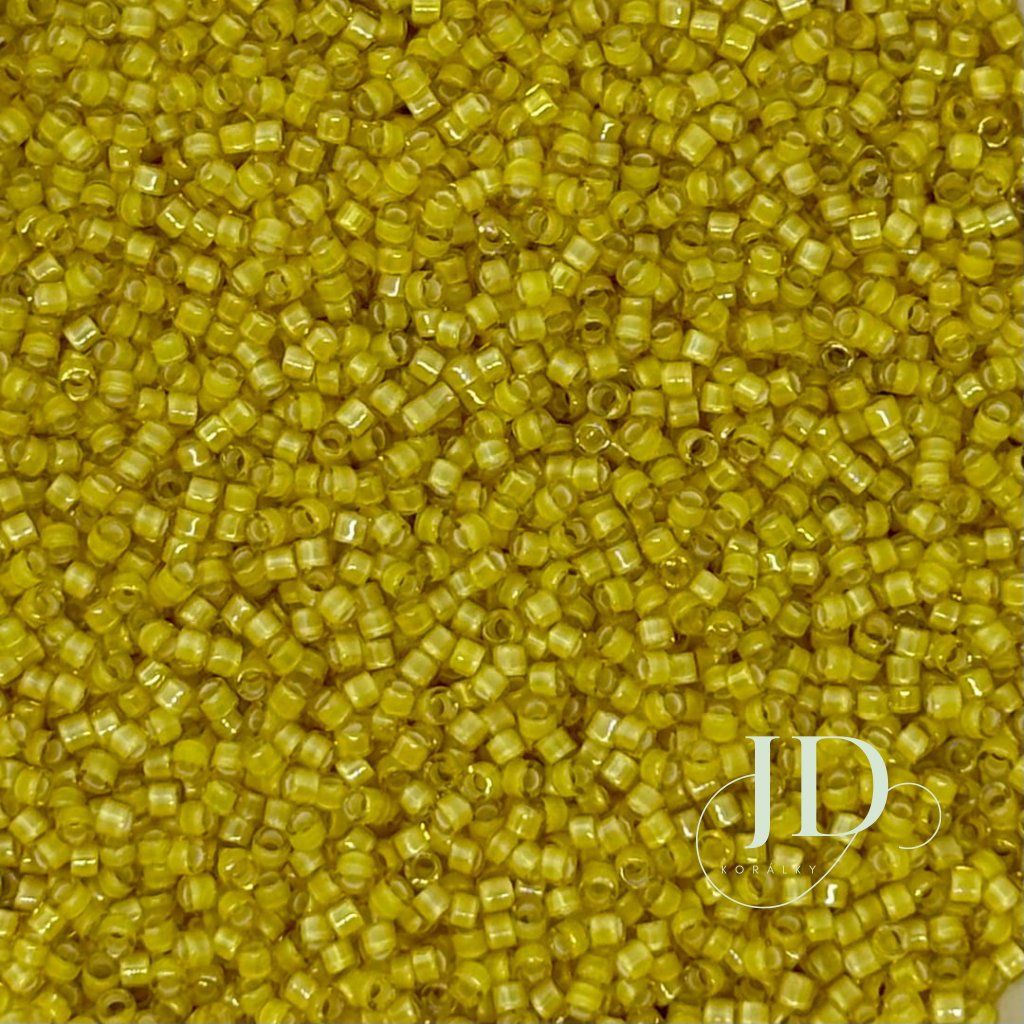 Poloprůhledné korálky Miyuki Delica 11/0 se žlutým základem, bílým průtahem a jemným duhovým AB leskem.